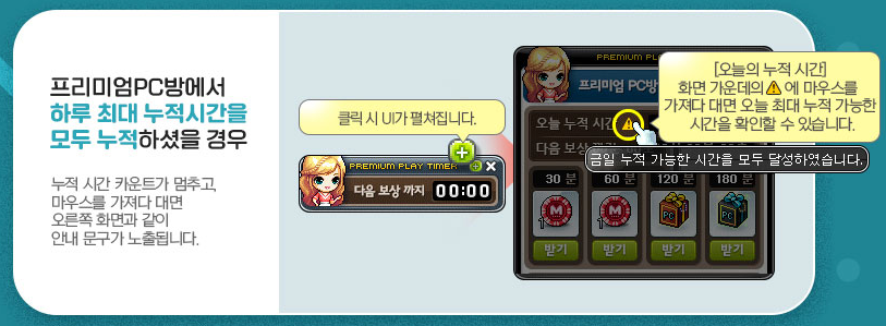 [메이플스토리] PC방 이벤트 메이플스토리 프리미엄PC방 원격피시방 지피방 120시간 일일 접속 마일리지 보상